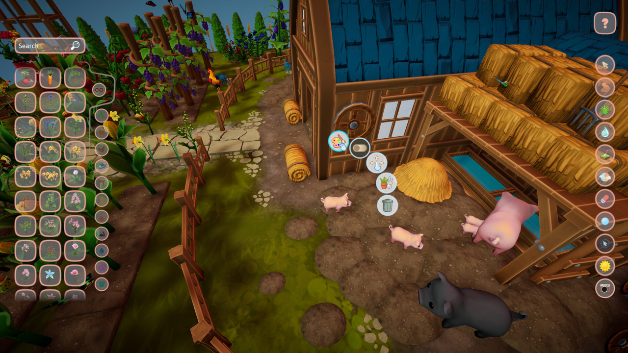 Игра встречает игрока абсолютно пустым пространством — чистым холстом, ждущим первых штрихов. Шаг за шагом это нейтральное поле превращается в причудливый микромир: появляются пышные растения, мерцающие фонари, крошечные животные, неспешно перемещающиеся по ландшафту. Визуальный стиль проекта выдержан в мягкой, стилизованной манере — каждая деталь, каждый элемент окружения работает на создание ощущения тепла, уюта и безмятежности.