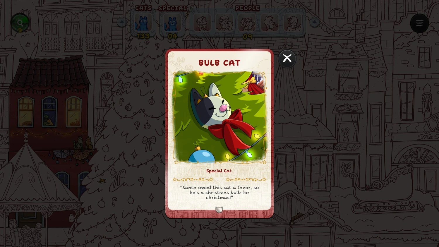 «Hidden Cats in Christmas» — казуальная игра в жанре «поиск предметов», где игрокам предстоит отыскать более 920 спрятанных кошек и персонажей на праздничных рождественских сценах.