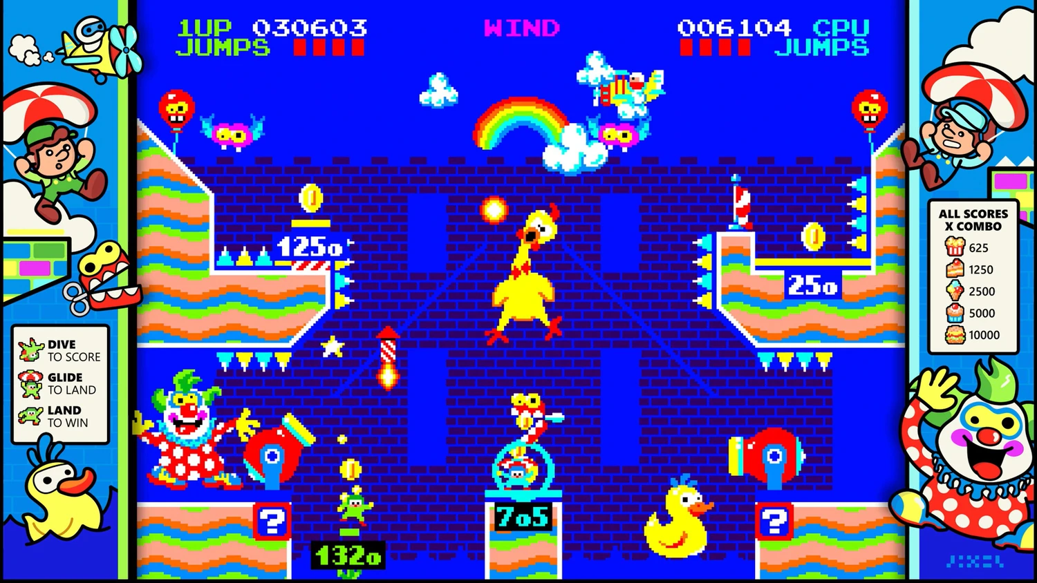 Механика геймплея и система очков: суть игрового процесса заключается в последовательных прыжках с самолёта на разнообразные платформы, разбросанные по уровню. У игрока ограничено количество прыжков, поэтому каждое движение должно быть продуманным. Чем меньше площадь платформы, на которую удаётся приземлиться, тем больше очков получает игрок, однако на пути встречаются враги и ловушки, требующие внимательности и точности. На каждом уровне присутствуют уникальные препятствия и предметы, сбор которых увеличивает счёт. Особую роль играет метр комбо: если игрок совершает последовательные успешные приземления, его очки умножаются, стимулируя непрерывную цепочку точных действий. После прохождения пяти уровней предстоит финальный прыжок с движущейся платформы — удачное выполнение этого элемента приносит бонусные очки и становится кульминацией этапа.
