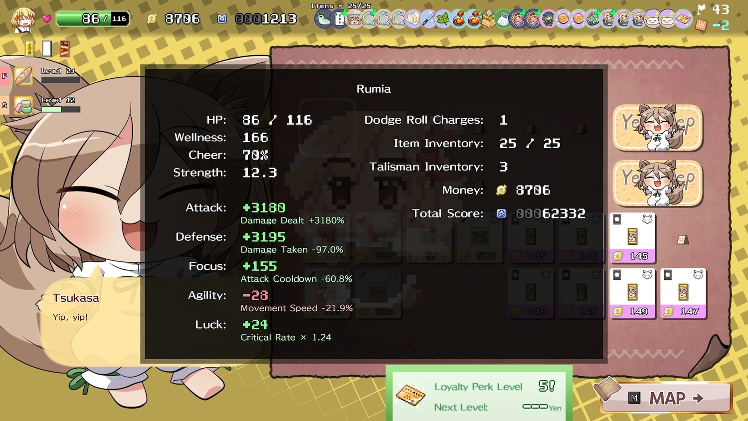 Ключевой механикой становится балансировка силы через поедание закусок. С одной стороны, каждая съеденная закуска усиливает Румию и открывает доступ к пассивным атакам, расширяя арсенал боевых возможностей. С другой — чрезмерное увлечение гастрономией чревато сонливостью: персонаж начинает замедляться, теряет манёвренность, и это может стоить жизни в напряжённом бою. Таким образом, игрок постоянно решает небольшую головоломку: когда стоит подкрепиться для роста мощи, а когда лучше воздержаться, чтобы сохранить бодрость и реакцию.