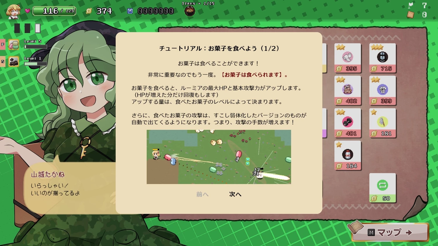 Вы берёте на себя роль Румии, которая в этой необычной истории использует в бою отнюдь не привычные магические способности, а сами закуски. Каждая из них стреляет характерным данмаку — узорными потоками пуль, — причём у каждого типа закусок есть свои выраженные сильные и слабые стороны. По мере сражений закуски повышают уровень, становясь мощнее и раскрывая дополнительные эффекты.