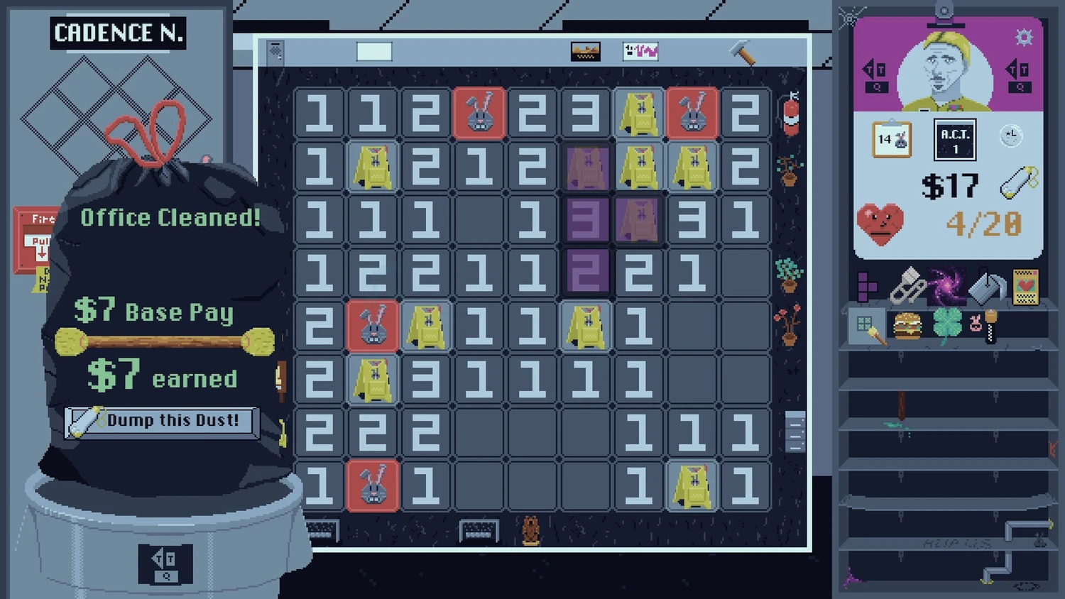 Суть игрового процесса: механика BroomSweeper базируется на классической игре Minesweeper, однако разработчики существенно обогатили её элементами roguelike. Игроку необходимо методично очищать плитки в лабиринте офисных помещений, стараясь не наткнуться на агрессивных «пушинок» — необычных противников, скрывающихся в пыли. Помимо осторожного продвижения, приходится активно использовать предупреждающие знаки и тщательно продумывать каждый шаг: цифры на плитках могут вводить в заблуждение, а опасность в ночном комплексе постоянно нарастает, превращая рутинную уборку в напряжённое испытание на выживание.
