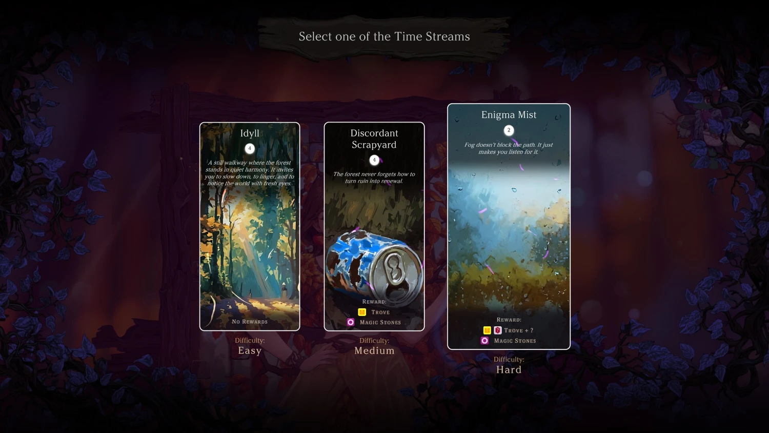 Исследование мира и сбор ресурсов: действие разворачивается в таинственном лесу, наполненном загадочными артефактами и скрытыми сокровищами. Игроку предстоит внимательно изучать окружение, собирая древние жезлы, мистические камни, плащи из листьев и даже черепа лосей. Важная часть геймплея — очистка леса от мусора, что не только улучшает состояние экосистемы, но и позволяет заслужить благодарность его обитателей, открывая доступ к новым возможностям. Каждое открытие и найденный предмет вносят вклад в общее понимание мира и его тайн.