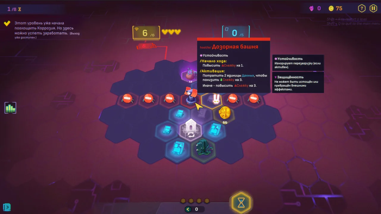 Суть игрового процесса: механика игры строится на активации специфических узлов на гексагональной сетке — это не просто запускает определённые эффекты, но и меняет топологию доступного пространства. Синие ячейки отвечают за генерацию массивов данных, жёлтые сектора обеспечивают приток кредитов, красные зоны несут угрозу, а зелёные платформы дают защиту. Всё это разворачивается на фоне покинутой людьми кибернетической страны чудес — атмосферы, насыщенной отсылками к сетевой культуре.