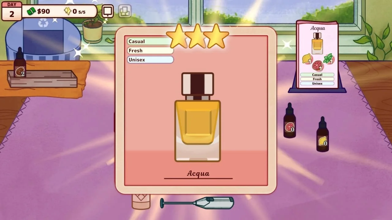 Оформление продукции играет не менее важную роль, чем её содержимое: в Perfume Atelier игрок получает полную свободу в дизайне флаконов. Можно выбирать форму сосуда, тип крышки, цветовую гамму и коллекционные этикетки — каждый элемент вносит вклад в индивидуальность творения. Тщательно продуманный внешний вид не только подчёркивает уникальность аромата, но и повышает привлекательность продукта для клиентов. Кроме того, игрок может декорировать само ателье, превращая его в уютное и стильное пространство, которое будет притягивать новых посетителей.