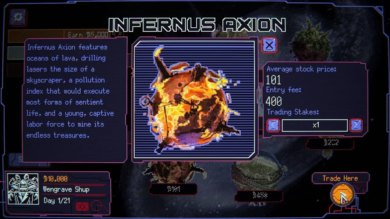 Ключевые игровые механики: система управления капиталом включает несколько важных инструментов для достижения финансового успеха. Игроки могут нанимать консультантов ради инсайдерской информации, играть на понижение при прогнозируемом падении стоимости активов, взаимодействовать с ростовщиком (который, впрочем, не заинтересован в возврате долгов) и получать торговые лицензии на семи разных планетах. Каждая планета предлагает уникальную экономическую модель, влияющую на стратегии торговли и подходы к накоплению капитала.