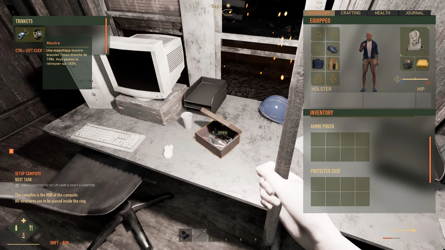Ремесло и ресурсопользование: выживание в The Gold River Project немыслимо без умения создавать необходимые инструменты и снаряжение. Игрокам придётся проявлять смекалку, используя подручные материалы для изготовления всего, что может пригодиться в борьбе за жизнь — от простейших орудий до более сложных приспособлений. Грамотное управление ресурсами становится краеугольным камнем успеха: каждый найденный предмет, каждая капля воды и каждый кусок пищи имеют огромную ценность в этом безжалостном мире.