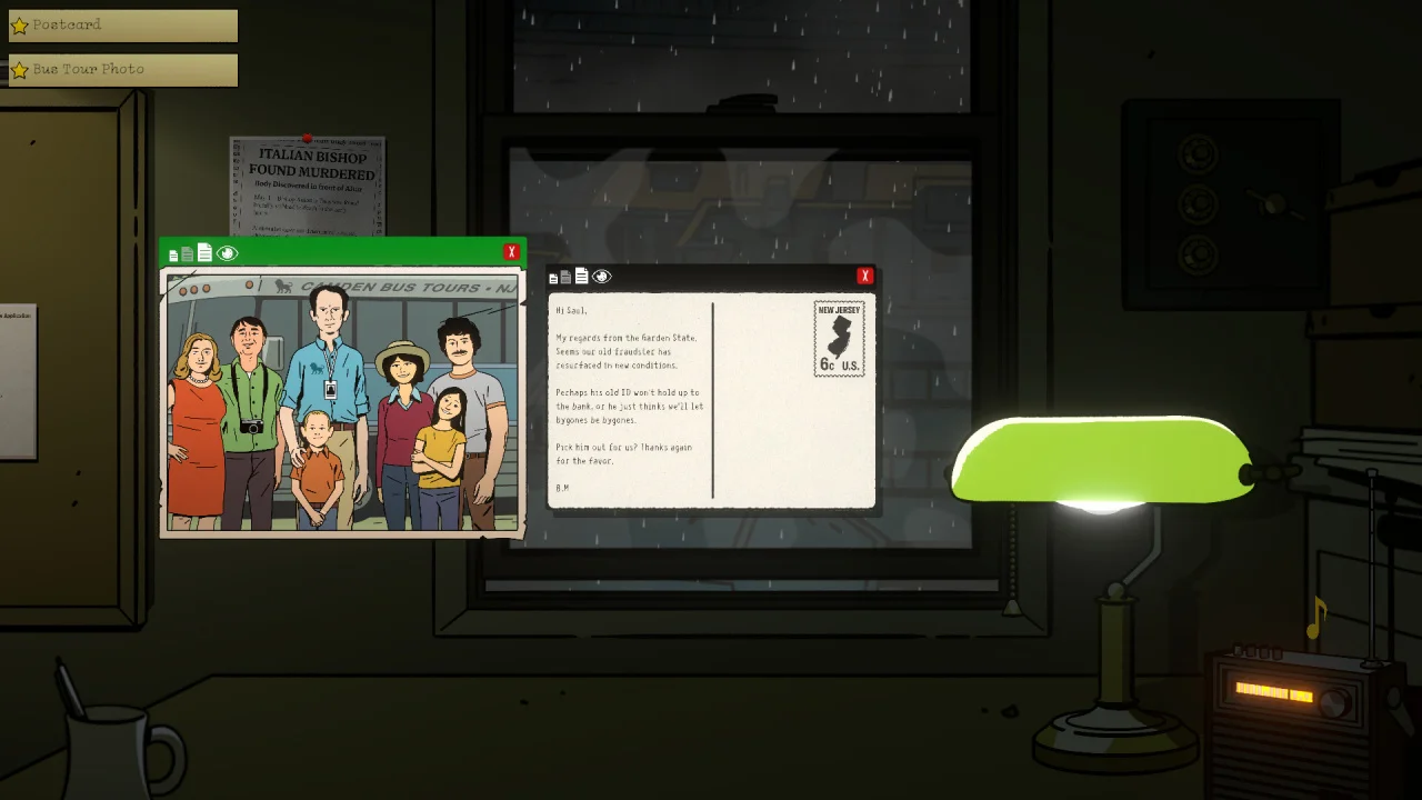 Центральным элементом The Ratline является пробковая доска, на которой игрок соединяет улики, фотографии, письма и расшифровки разговоров с помощью нитей и булавок. Каждый фрагмент информации требует внимательного изучения — увеличения, поворота, сравнения с другими материалами. Никаких подсказок или выделения ключевых деталей: только собственная наблюдательность и логика. Даже мелкая деталь на обороте снимка или несоответствие в датах может стать ключом к разгадке. Эта механика погружает в ощущение настоящего расследования, где каждый шаг — результат кропотливого труда.